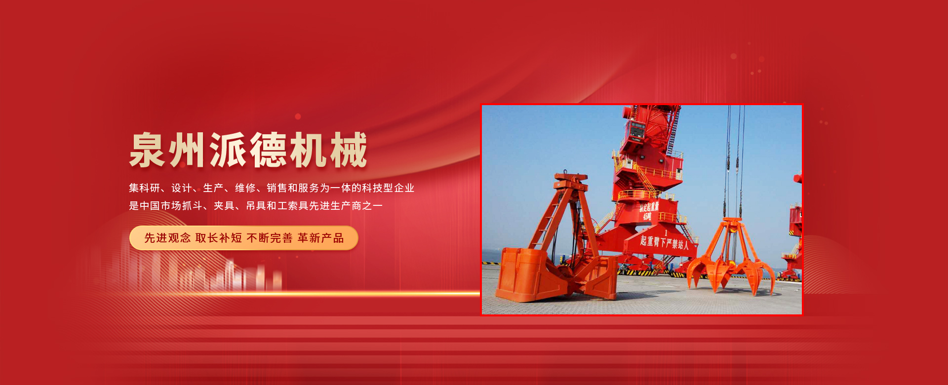 泉州派德機(jī)械有限公司成立于2012年5月,位于全國文明的古城福建泉州,公司擁有各類型專業(yè)員工82人,其中高級(jí)工程師1人,工程師4人,助理工程師5人,是一家集科研、設(shè)計(jì)、生產(chǎn)、維修、銷售和服務(wù)為一體的科技型企業(yè),是中國市場抓斗、夾具、吊具和工索具先進(jìn)生產(chǎn)商之一。產(chǎn)品采用國內(nèi)外先進(jìn)的設(shè)計(jì)方案、技術(shù)規(guī)范、制造過程、工藝流程和服務(wù),憑借在抓斗、夾具、吊具和工索具領(lǐng)域的超前設(shè)計(jì)理念和成熟的技術(shù)、工藝和管理,在抓具領(lǐng)域迅速崛起。